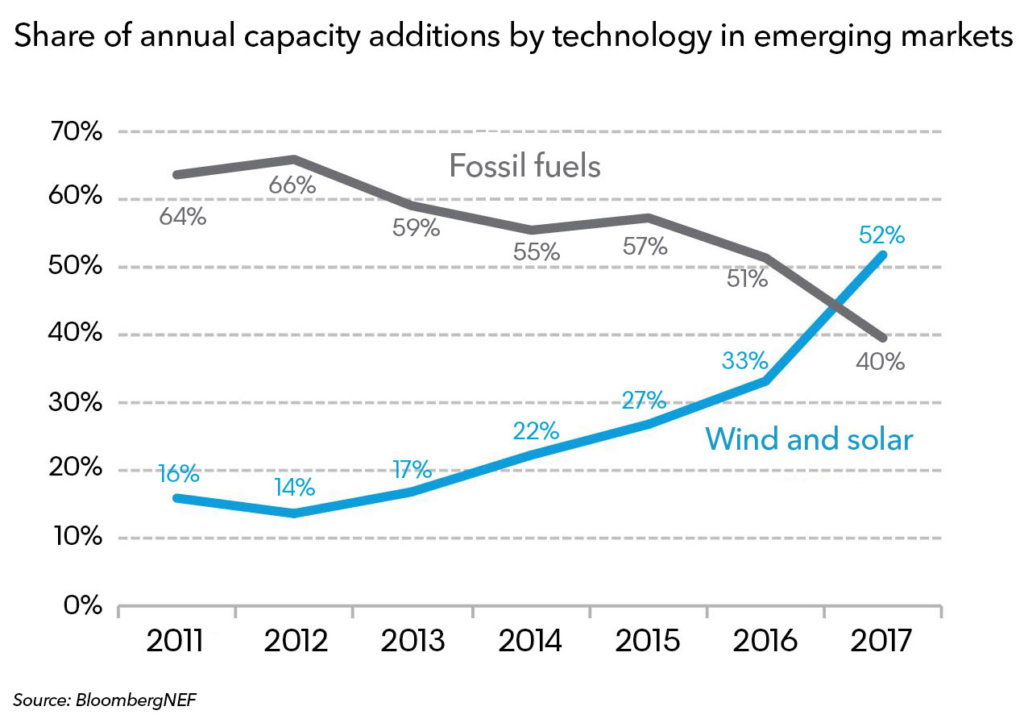 In 2017, developing nations added 114 GW of zero-carbon generating capacity of all types (including nuclear, large hydro and other renewables), with 94 GW of wind and solar generating capacity alone – both all-time records, according to BNEF.