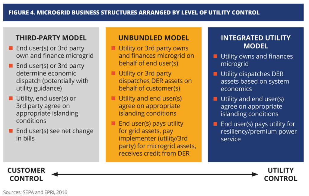 – Microgrid business models are evolving along a continuum, from third-party projects to utility-initiated projects. In between, a hybrid, “unbundled” model based on public-private partnerships is emerging, which could offer more flexibility and opportunities for collaboration.