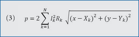 The total power loss (p) in the connecting conductors can be represented as equation (1), where pk is the power loss in the kth homerun, and dk is the distance of the kth combiner box from the inverter (x,y) given by equation (2).