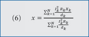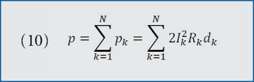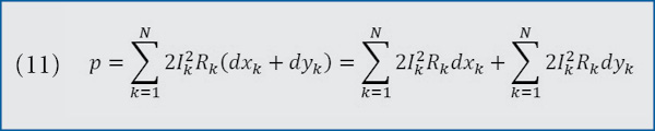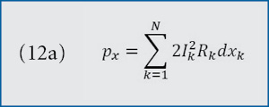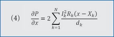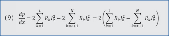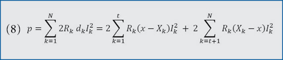 With pk, Ik, dk and Rk defined using the same procedure that the first case did, we have the total power loss, represented as p (8). Then, take the derivative of P with respect to x (9). The expression for the derivative of p with respect to x is independent of x.