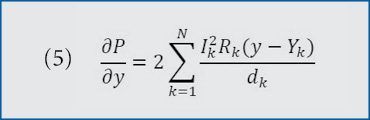 Differentiating power loss as a solved constant (P) once with respect to x and once with respect to y gives equations (4) and (5). Setting equations (4) and (5) equal to zero and solving for x and for y, we arrive at equations (6) and (7), respectively. Equations (6) and (7) give the coordinates of the inverter for the minimum total power loss (Pmin).