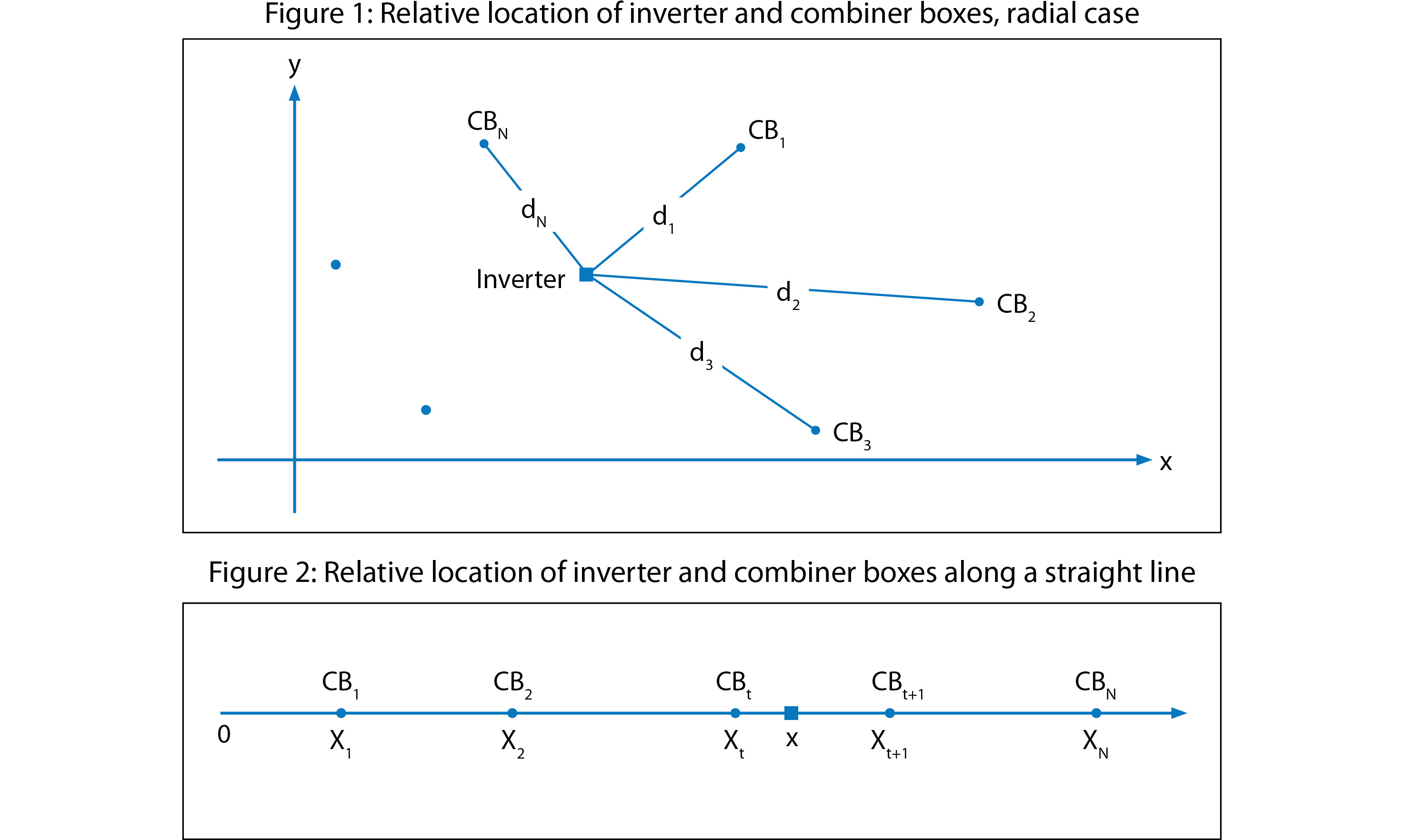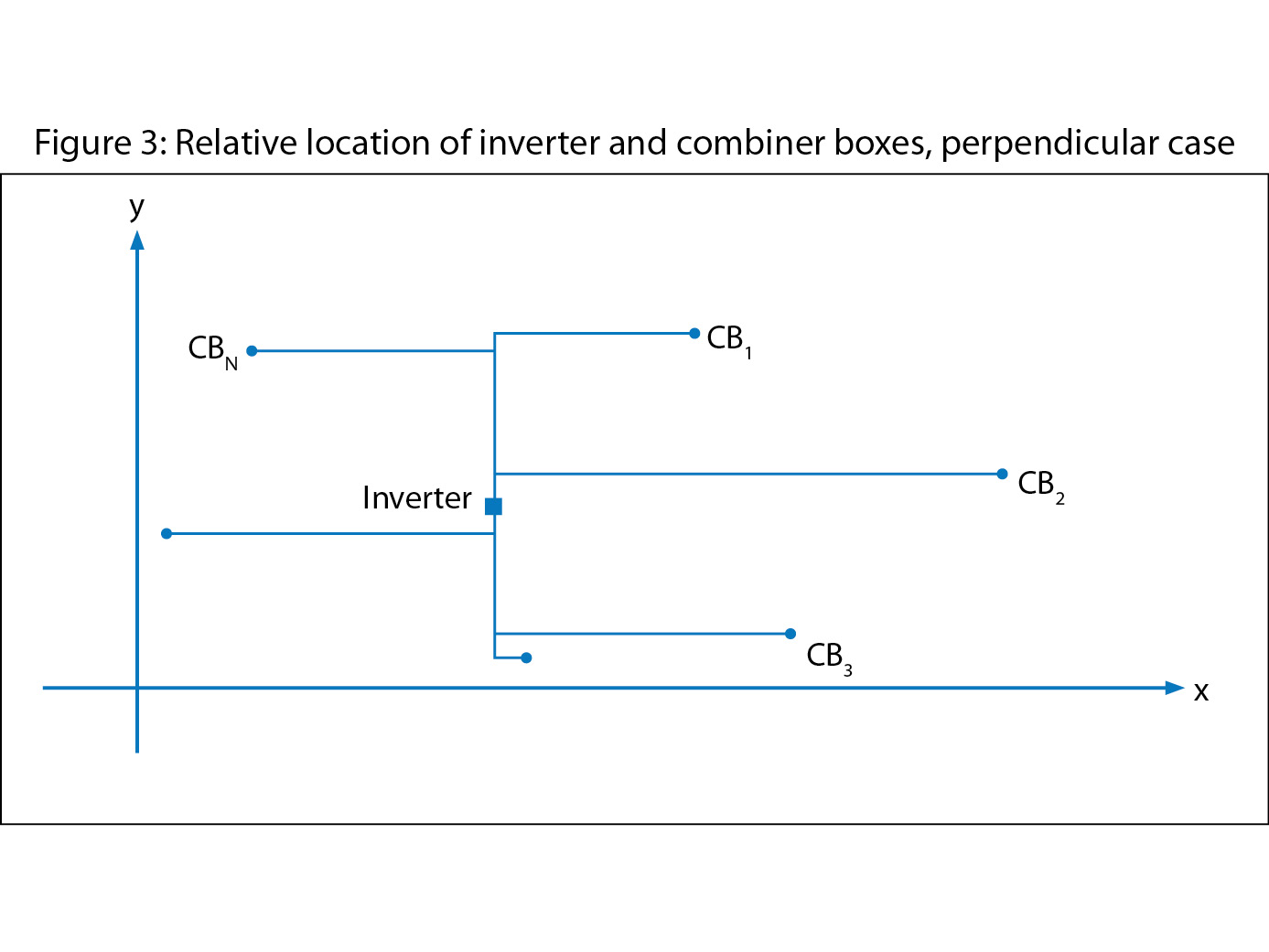 The configuration of the first case - where homeruns radially connect combiner boxes (CB) to the inverter along single straight lines - is represented in a general form in Figure 1.