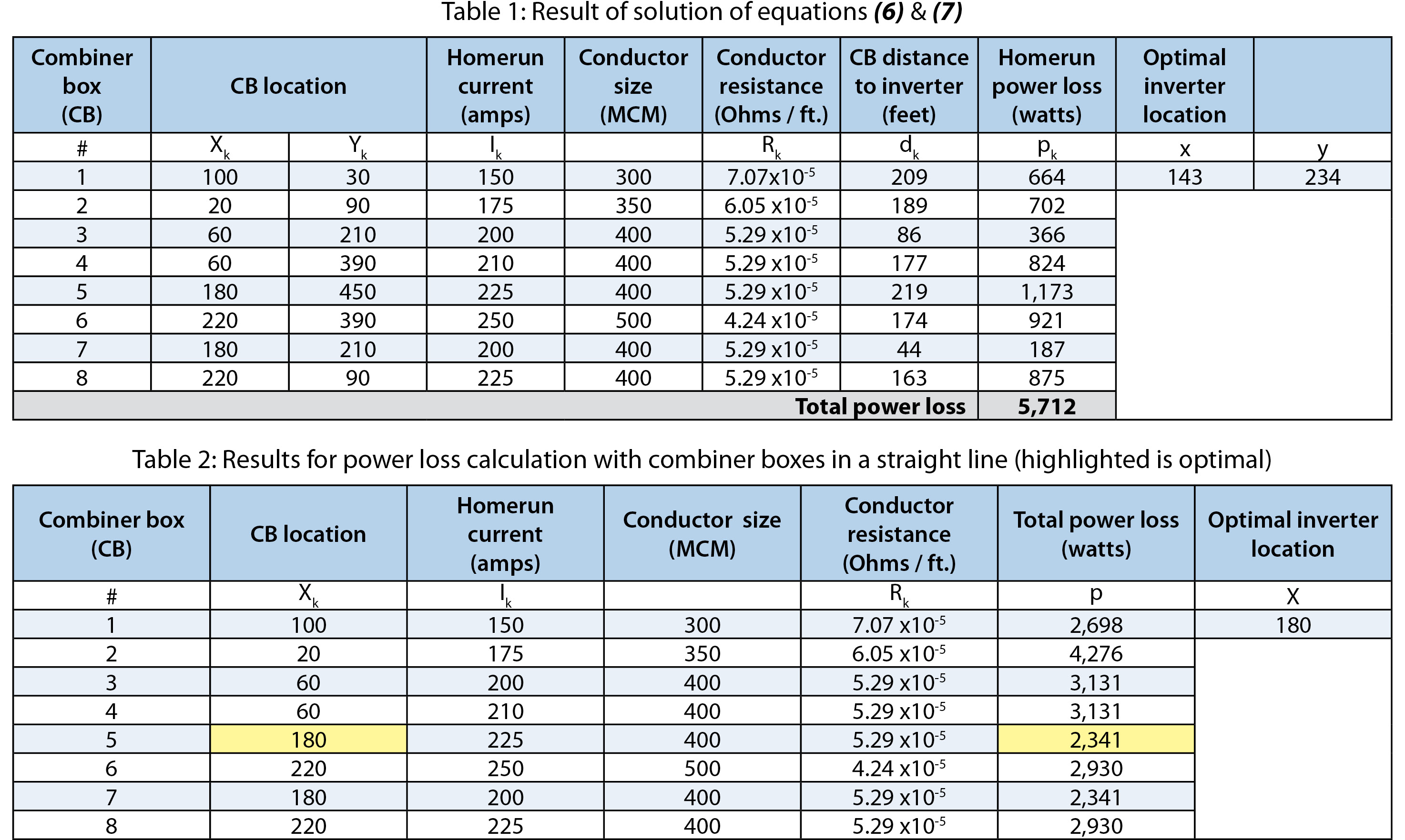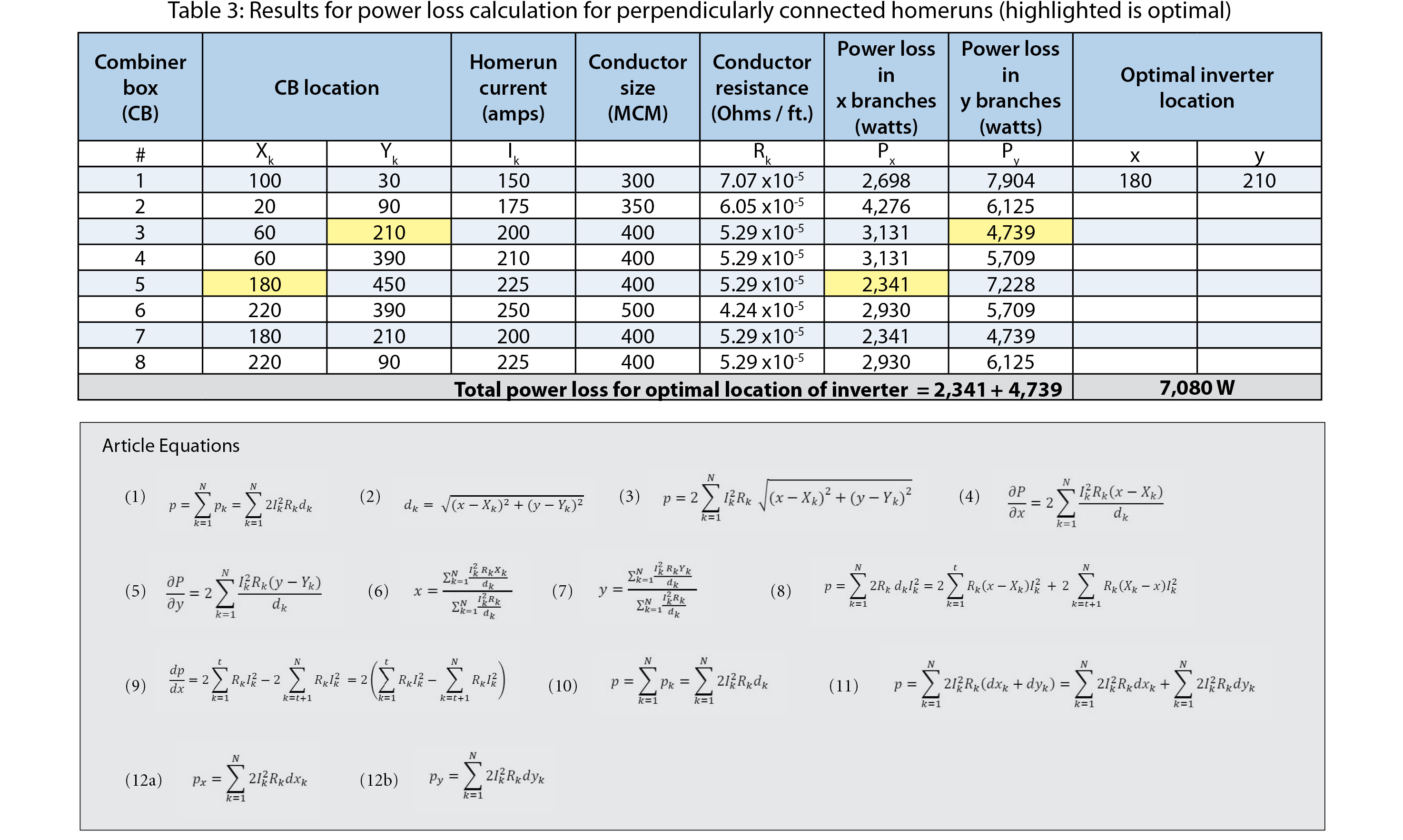 Quantities given for x and y in the last two columns of the table show the result of the iterative solution of equations (6) and (7) corresponding to the optimal location of the inverter. The calculated distance for each combiner box to this inverter location and the power loss in each conductor are also shown.